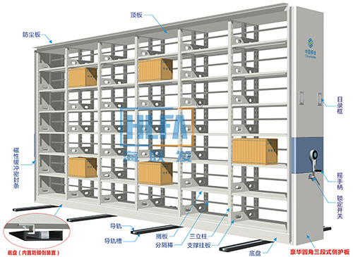 密集架按結(jié)構(gòu)分類有兩種形式,半封閉式密集架和全封閉式密集架,海發(fā)HF-MJFB051號密集架就是全封閉式密集架。全封閉式密集架主體由立柱、層板、頂板、底板、節(jié)間側(cè)板、節(jié)與節(jié)之前的封板和最外側(cè)護(hù)板、列門板等組成,比半封閉式密集架多了私密性,因此主要用于存放私密性較強(qiáng)或較小物品的存儲(chǔ)。